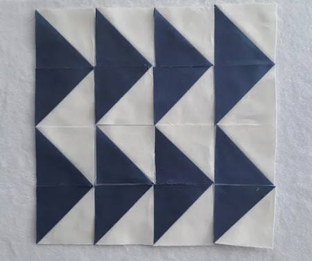 I used “triangles-on-a-roll paper” to make my 2-inch HSTs for this post. It’s not the most economical way to make them, but it is fast. All of the half-square triangle layouts shown in this post require 16 HST units, but you can use these layouts with any size half-square triangles you want.
