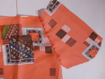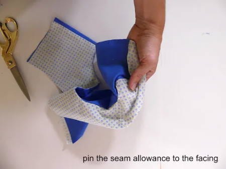 4. Once you’ve clipped and trimmed the seam allowance, you can press the facing away from the garment, along with the trimmed seam allowance. Pin the seam allowance to the facing on the right side of the fabric.